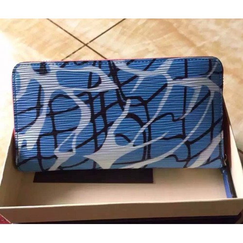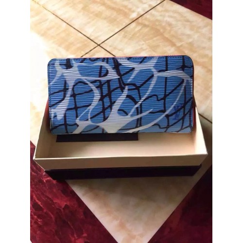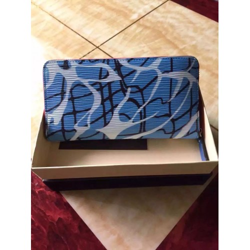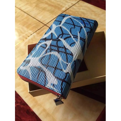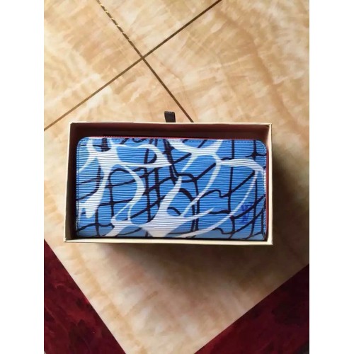 LOUIS VUITTON ZIPPY WALLET M56233SKU:baihui-012SIZE: 19 CM- 8 credit card slots- 1 large zipped coin pocket- 3 large gusseted compartments- 3 inside flat pockets- Wide zipper closure- Printed Epi leather, grained cowhide leather lining- Shiny silver color metallic piecesCapturing the spirit of summer, the striking Aqua pattern, seen at Louis Vuitton's Cruise 2016 show, was inspired by light playing on the surface of a swimming pool. The iconic Zippy wallet in printed Epi leather has a compact design and generous interior, making it a true essential.