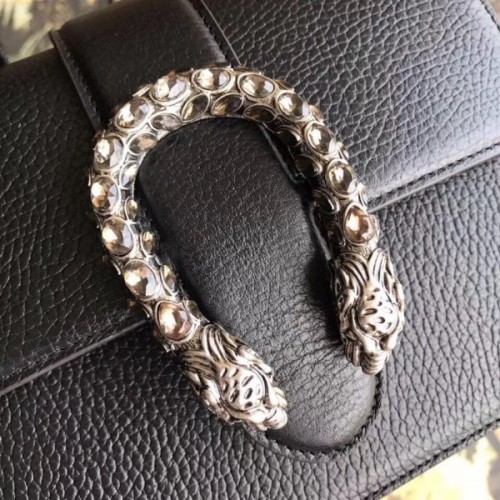 Presented in a new, mini size for Pre-Fall 2018, this Dionysus bag in textured black leather is defined by the tiger head spur closure-a unique detail referencing the Greek god Dionysus, who in myth is said to have crossed the river Tigris on a tiger sent to him by Zeus. Sparkling crystals illuminate the buckle, while a bamboo handle completes the accessory.